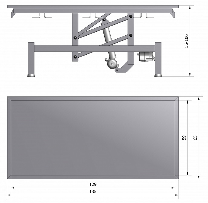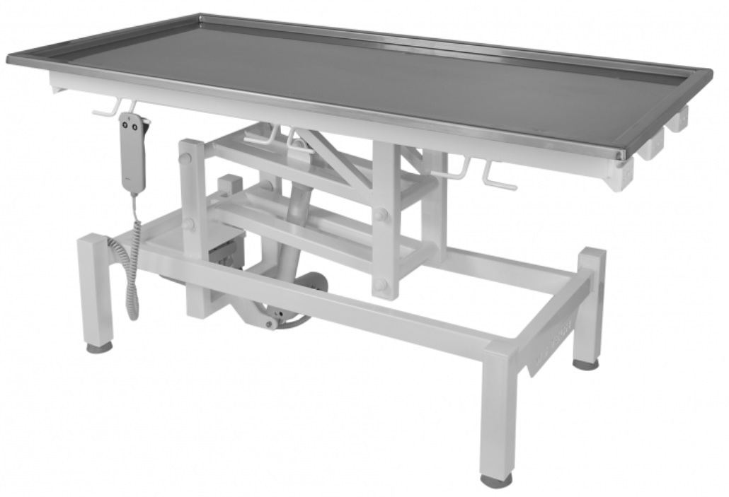 Całość konstrukcji pokryta jest odporną na uszkodzenia mechaniczne i zarysowania farbą proszkową. W standardzie stół posiada w pełni łożyskowaną elektryczną regulację wysokości za pomocą pilota ręcznego oraz pogłębiony blat wykonany ze stali kwasoodpornej. Standardowo stół posiada uchwyty umożliwiające montaż opcji dodatkowych.